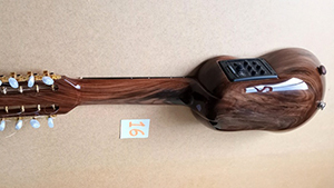 通常の左右シンメトリーのノーマル仕様のチャランゴです。飾り気がない極めてスタンダードでオーソドックスなものです。こういうものがいわゆる伝統に共に成長し発展したものでしょう。胴体がナランヒージョで指板がエバノです。現在、ワシントン条約で木材規制がどんどんと厳しくなっておりますのでエバノ(黒檀)は楽器に使えなくなるでしょう。2台到着してます。